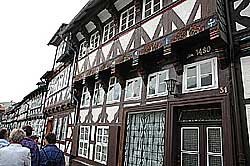 | アン・デア・ゴーゼ通りの東端にひときわ立派な木骨組みの家(下写真)があります。 この先を左に入るとボルツアーテンヴィンケル通りです。 |