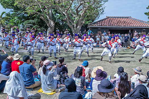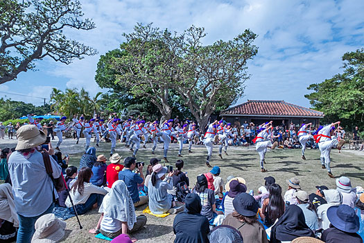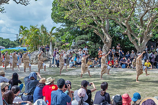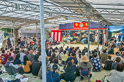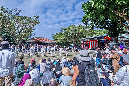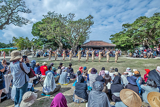 スピーカの音声が聞こえてくる先の広場では大勢の人々が集まり伝統芸能を楽しんでいました。ここが種子取祭のメイン会場のようです。