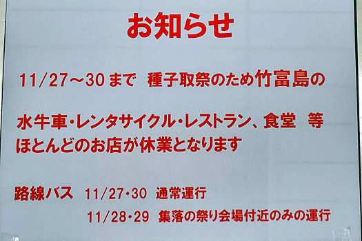 カウンターを見ると右下写真の注意書きが張ってあります。「種子取祭ってなんだ???」どうも竹富島最大のお祭りのようです。