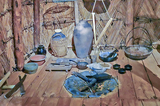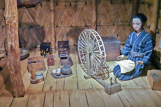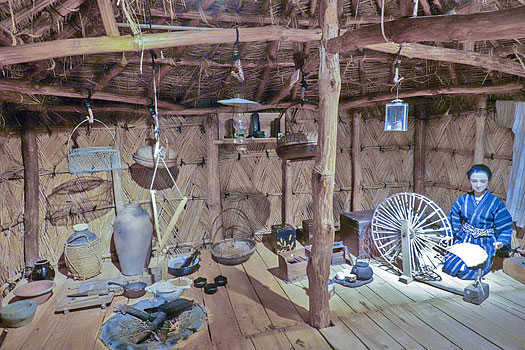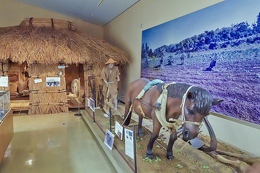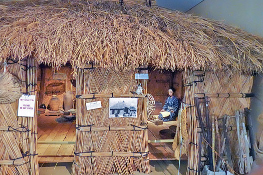 この藁葺家(カヤヤー)は明治から昭和初期頃の宮古のある程度裕福な農家を想定して復元されたもので、大きさは2間×3間、地炉(ズーユ)が設けられ、台所は添家 (スゥイヤー) にあったそうです。
