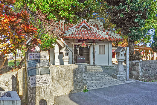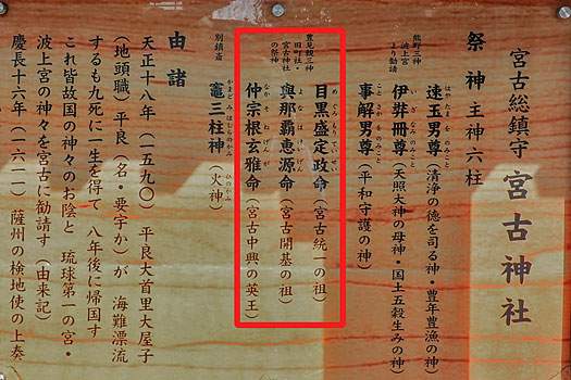 神社の由緒書きには、目黒盛豊見親は「宮古統一の祖」、與那覇豊見親は「宮古開基の祖」、仲宗根豊見親は「宮古中興の英王」と記されています。いずれも宮古の豪族です。