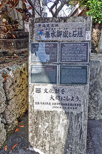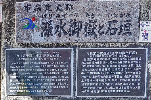 御嶽前の説明板によると、漲水御嶽は、宮古島創世の神話や人蛇婚説話にいろどられ、宮古人の源流を探る貴重な御嶽とされています。