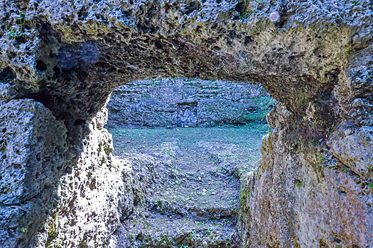 ガイドさんの説明と散策マップの説明書によると、14世紀頃の宮古は領土争いが絶えず、中でも與那覇の軍は村々を襲い荒らし回っていたそうです。與那覇は目黒盛に戦いを仕掛けます。漲水の崖まで追い詰められた目黒盛は死を覚悟しますが、突如一匹の犬が洞穴から飛び出し、敵に襲いかかったそうです。