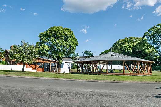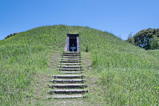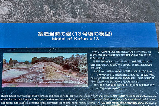 13号墳は、1600年以上前に築造されたもので、全体が葺石で覆われていました。現在は墳丘保護のために土で覆われ、 形状だけを復元し表面には芝が貼ってあるそうです。墳丘前には築造当時の姿を再現した1/20の模型が展示されています。