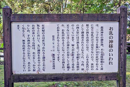 都萬神社の境内社「乳神」です。都萬神社の主祭神木花開耶姫命(このはなさくやひめのみこと)は、三皇子を無戸室(うつむろ)の産屋で産みますが、母乳だけでは足りず狭田(さなだ)の稲で甘酒を造り養育したと記されています。