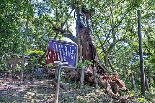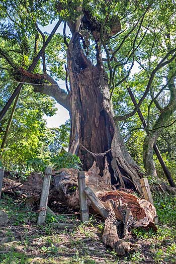 都萬神社本殿南側に聳える幹の大半が空洞になった樹齢1200年と言われる妻のクスです。過去の台風災害や二度の火災に耐えてきました。