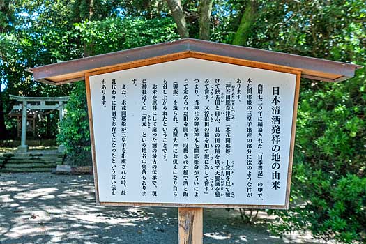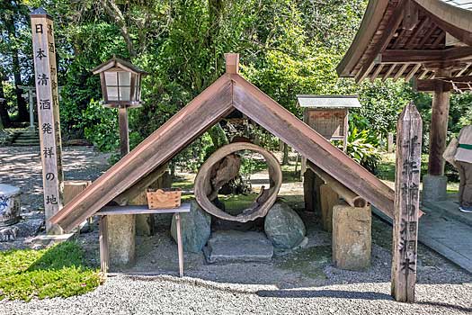 洞洞木の隣には「日本清酒発祥の地」と記された柱が立っています。説明書によると、都萬神社の祭神である木花開耶姫が田を開き、収穫した稲で酒と飯を造り天照大御神に供えたことが日本書紀に記されているそうです。米を原料として造った酒の最古の伝承です。