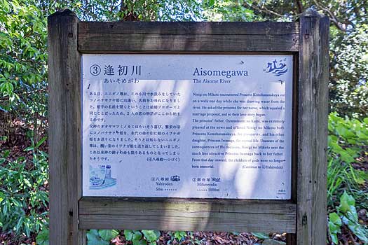 伝承によると、ある日、瓊瓊杵命は、この小川で水汲みをしていた木花開耶姫に出会い求婚します。