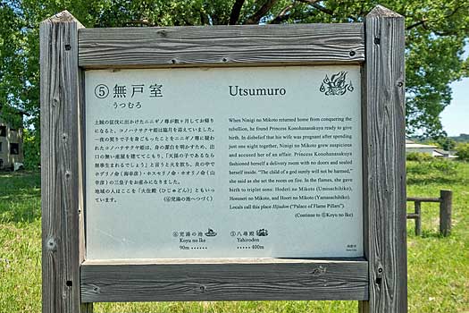 土賊の征伐に出かけた瓊瓊杵命(ににぎのみこと)が数ヶ月後に八尋殿に帰ると、木花開耶姫は臨月を迎えていました。一夜の契りで身ごもったことを夫に疑われた姫は身の潔白を明かすため出口のない産屋(無戸室)をここに建て、中に籠り、「天孫(ニニギ)の子であるなら無事に産まれるはず」と産屋に火を放ち、炎の中で三皇子を産んだとされています。