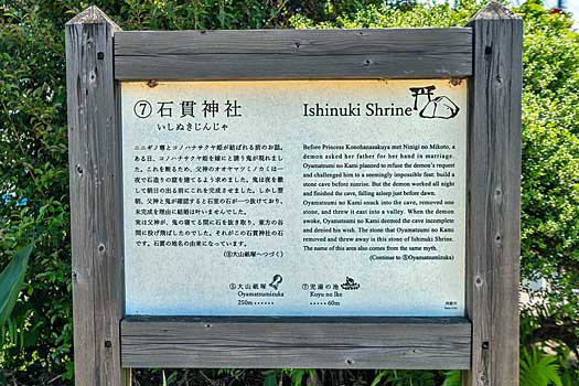 ある時、木花開耶姫を嫁にと請う鬼が現れ、父神のオオヤマツミノカミは一夜で窟(いわや)を建てるという条件を提示します。鬼は日の出前に完成させますが、翌朝、父神と鬼が確認すると石が一つ抜けていたため鬼の求婚は叶いませんでした。
