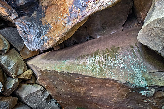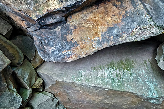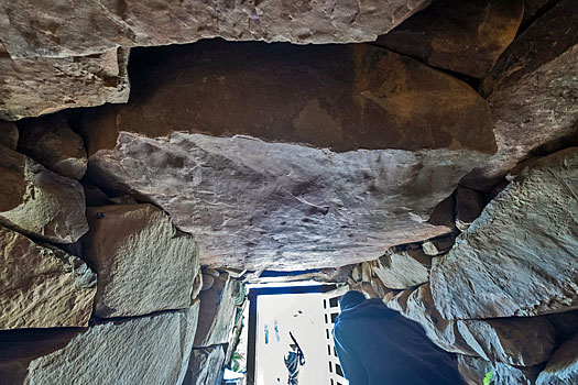 入り口付近は非常に狭く、上の写真は石室から入り口方向を撮ったものですが、手前上の石の隙間がそれです。右下の写真は真下から、左下の写真は斜めから撮ったものです。