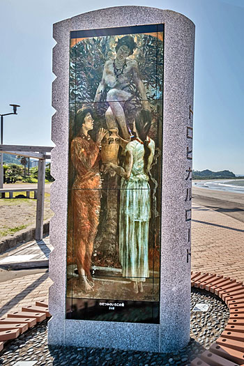 上の写真は青島に渡る弥生橋の手前の公園内に建てられた記念碑です。描かれている画は青木繁画伯の「わだつみのいろこの宮」です。桂の木に登っているのは山幸彦、壺を持つ女性は豊玉姫(左)と侍女です。二人が出会い恋に落ちる場面が描かれています。