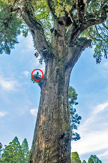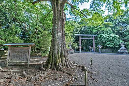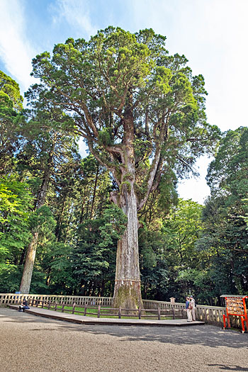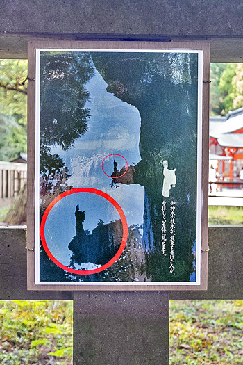 神木の枝木が装束姿の参拝者のように見えます。指摘する表示がなければ気付く人はほとんどいないでしょう。