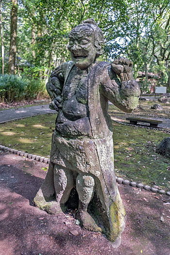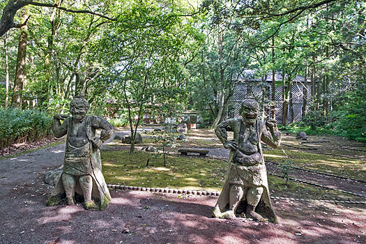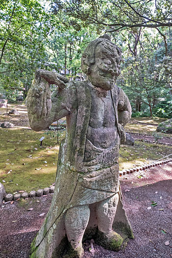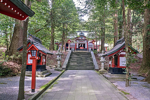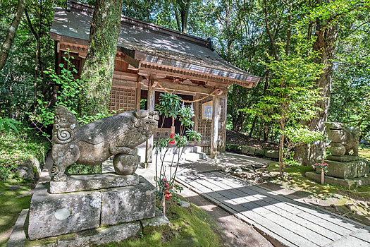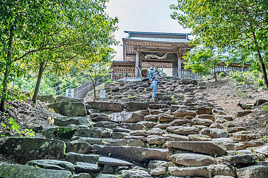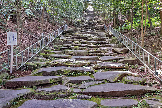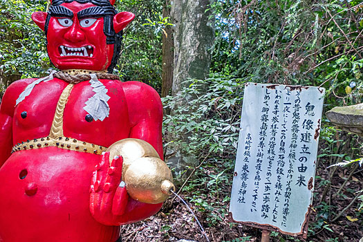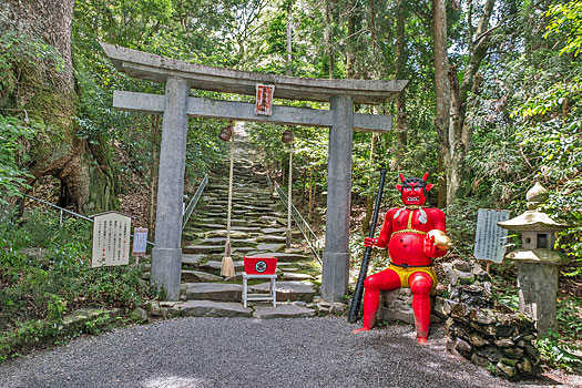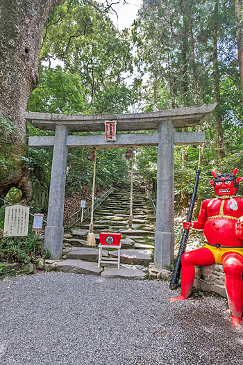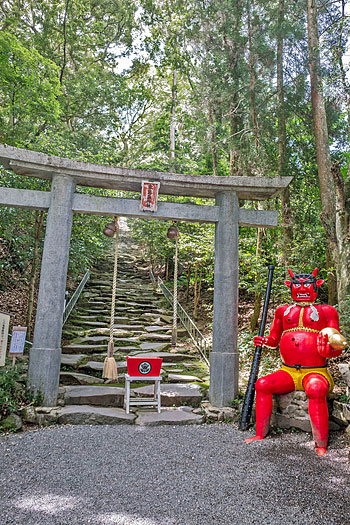 本殿に続く荒々しく石が積まれた鬼磐階段です。整然と積まれた階段とは異なり、滅多に見られないものです。「振りむかずの坂」とも言われ振り返らずに一歩一歩踏みしめて登るのが作法とされています。階段前の鳥居脇に置かれた鬼の像は、階段を作り騙された鬼を供養しているのかも知れません。