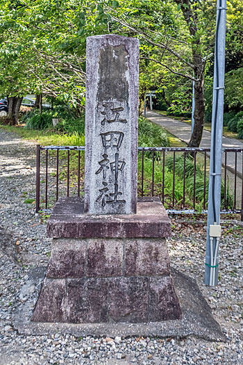 江田神社の鳥居前です。左脇に立つ社名の石碑の頭二文字が消されているのが気になります。