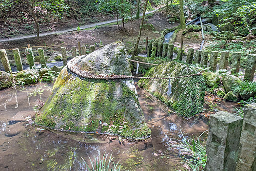イザナギは、今後再びこのような災難に世人が遭わないようにとの祈りを込めて佩いていた「十握の剣(とつかのつるぎ)」で石を三段に斬ったとされています。
