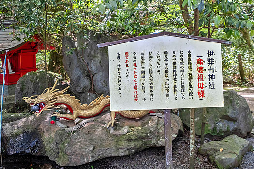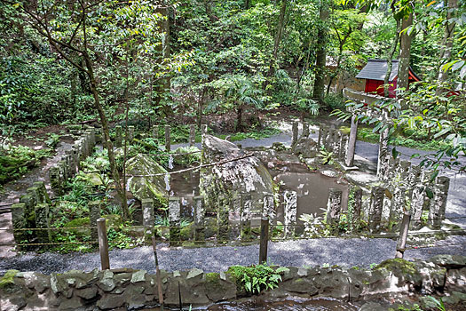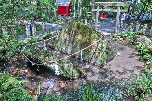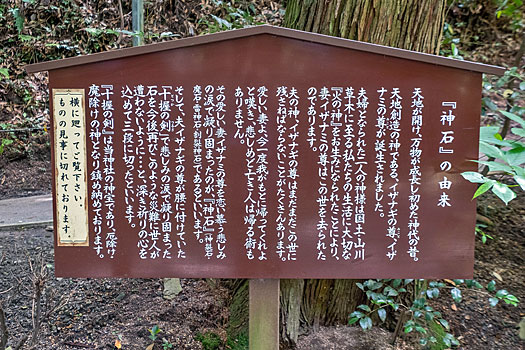 「神石」の由来書きによると、イザナギは妻イザナミが火の神を生んだことにより亡くなったことを嘆き悲しみ、流した涙が凝り固まったのが、この神石だと言われています。