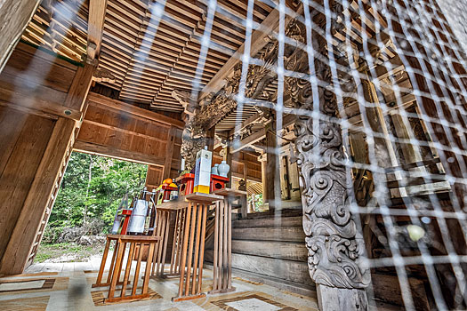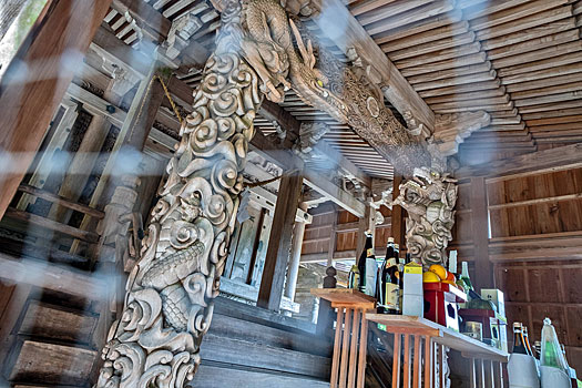 拝殿内では左右の龍神が彫られた柱が目を引きます。