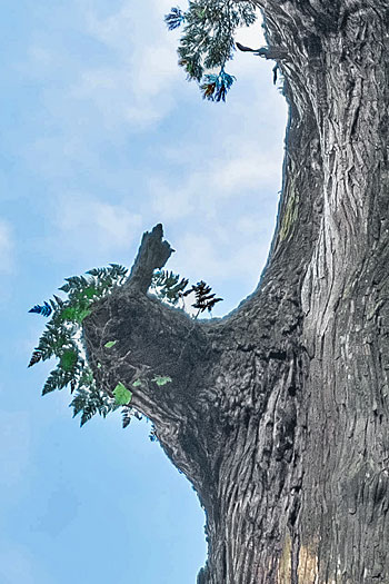 ![]() 装束姿の参拝者にみえる神木の枝 |